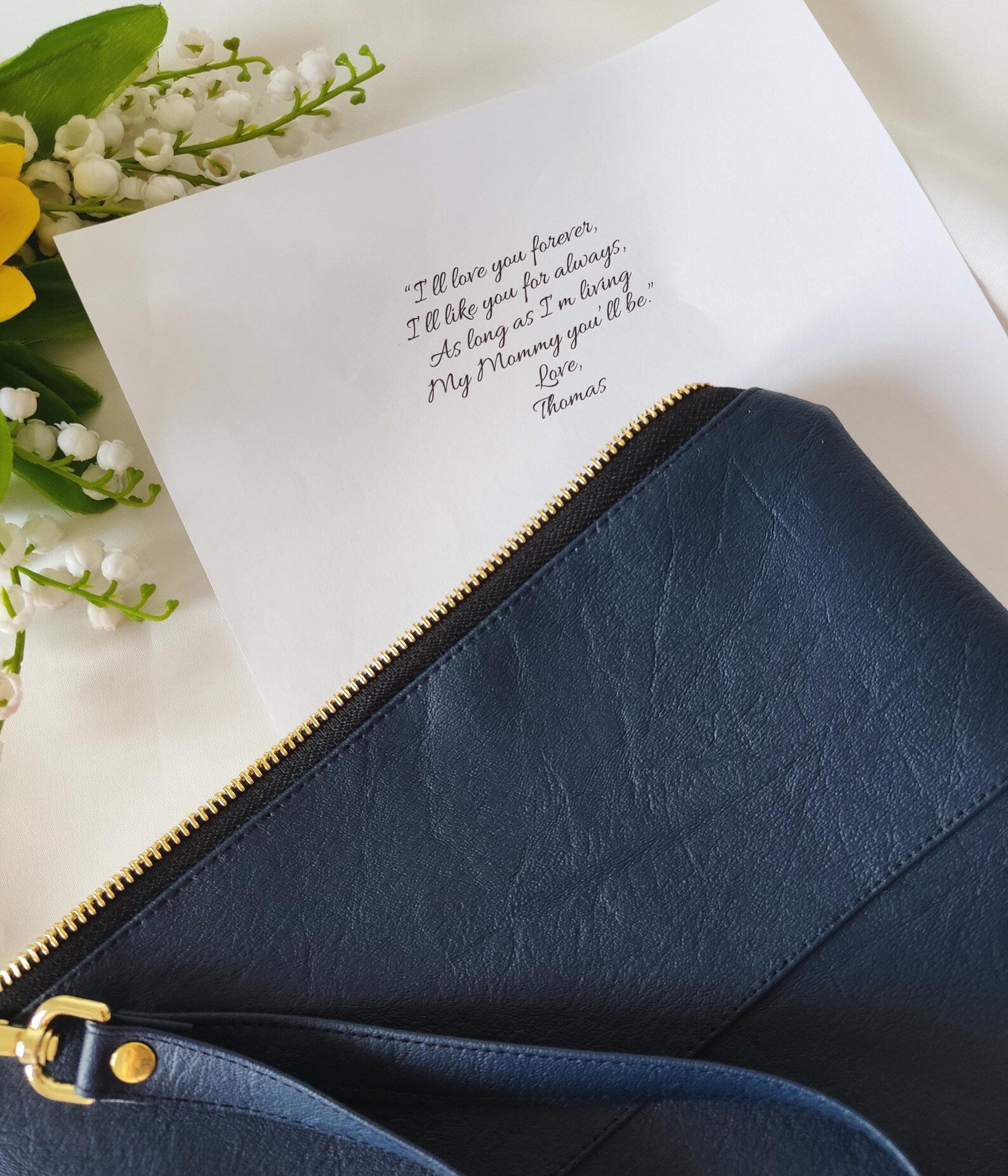 This clutch bag is handcrafted from high-quality faux leather in navy.