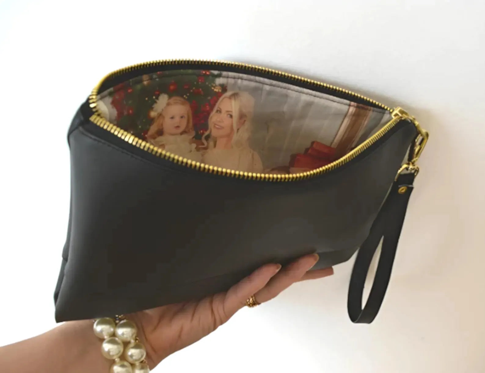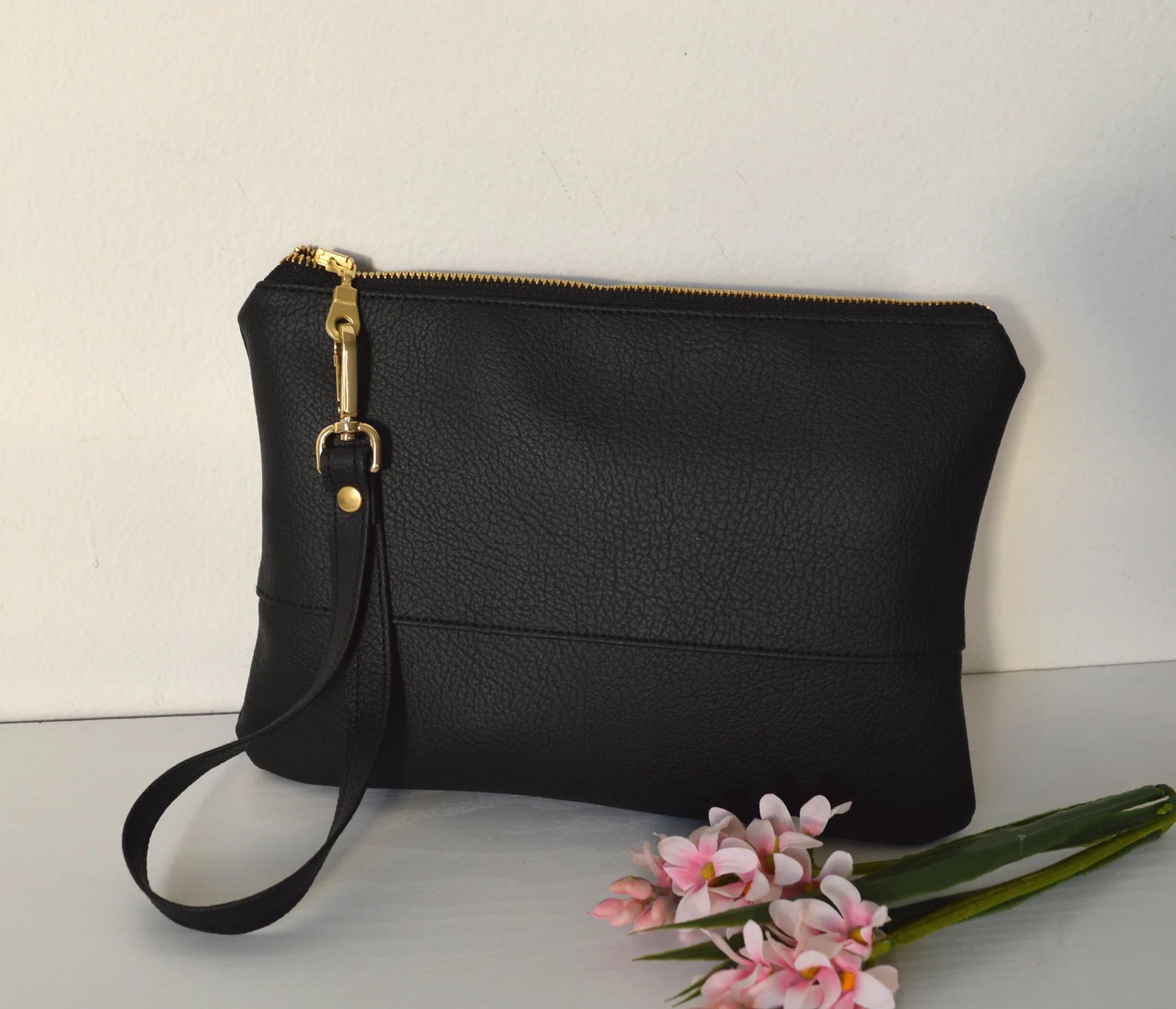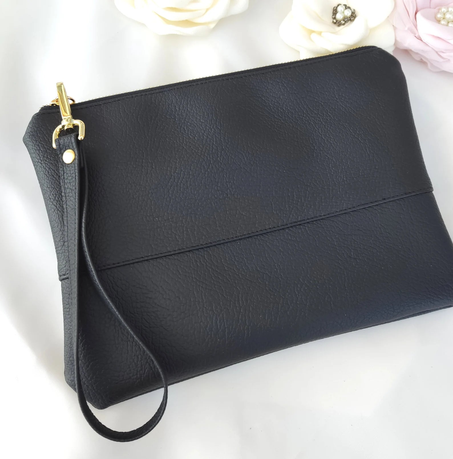 This clutch bag is handcrafted from high-quality faux leather in black.